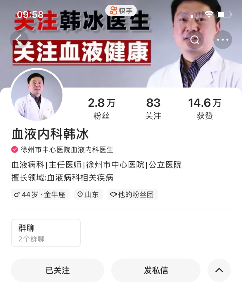 快手上的血液内科韩冰怎么样?值得信赖吗?